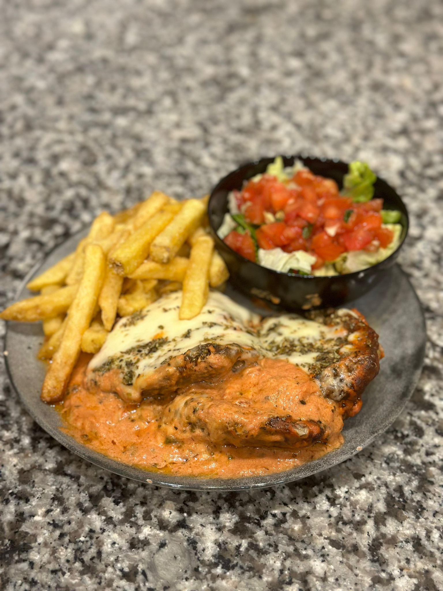 Notre Filet de Poulet Parmigiana est préparé avec les meilleurs filets de poulet, tendres et juteux. Le poulet est pané, puis recouvert d’une sauce tomate maison riche en saveurs et garni de fromage fondant, gratiné à la perfection. Chaque bouchée offre un mélange harmonieux de textures et de goûts, rendant ce plat irrésistible.